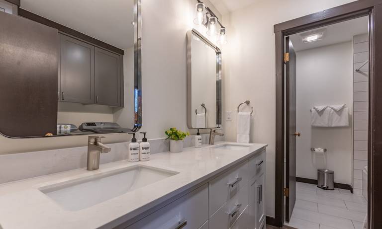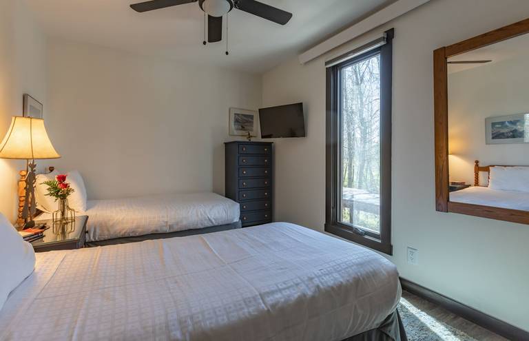 Modern and chic but inviting and comfortable, Dogwood 2721 is fully renovated and a true gem. Make yourself at home as you enter with the many coat hooks and bench inside the door. Wildlife art lines the walls for that Jackson Hole feel. The first bedroom lies to the right with a pair of twin beds that can be converted to a king bed upon request which makes this condo perfect for a family or couples looking for a mountain retreat. A television, a chest of drawers, a side table, and closet round out this first room.