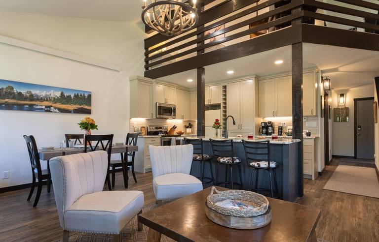 The Aspens, a quick five miles south of Teton Village, sits within walking distance of the Teton Pines Golf Course, as well as a gourmet market, well-stocked liquor store, two beloved restaurants (one Austrian, one Japanese), a bustling coffeehouse, a UPS store and a salon, among other conveniences.