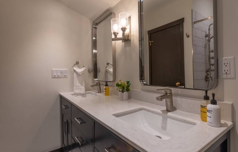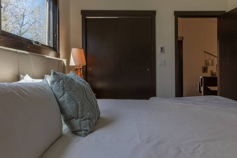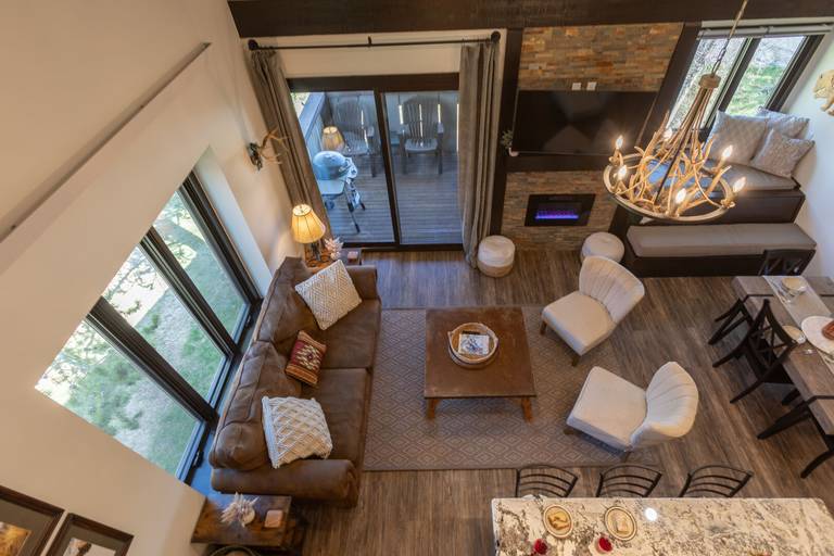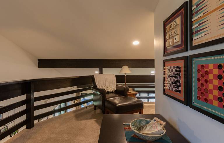 Climb the stairs and find a cozy twin bed tucked in the eaves overlooking the great room. Also in the loft guests can snuggle up with a good book in leather chair and ottoman or bring out your competitive side with the game table and stools. Upstairs also offers a a separate bedroom with a King bed backed by an upholstered headboard. A wall-mounted TV, closet and detached bath with a walk in shower featuring a double shower head round out the upstairs amenities.