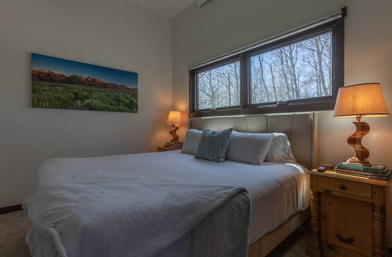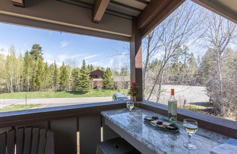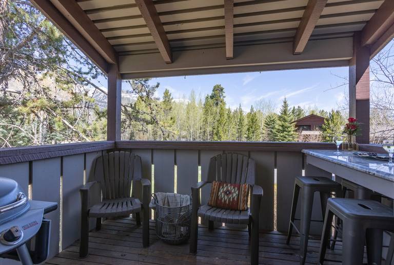 Continue on into the great room where you can relax on the cowhide barstools at the granite island or work in the well-stocked open kitchen. In the living/dining area, a dining table seats six. A window seat and bench overlook the pine trees and vast Teton view. Cozy up on the leather sofa or club chairs around an ample coffee table for family game night or watch TV on the flat screen mounted above the electric fireplace surrounded by stacked slate. Just off the great room a private deck invites lounging outdoors or grilling on the electric grill.