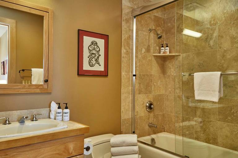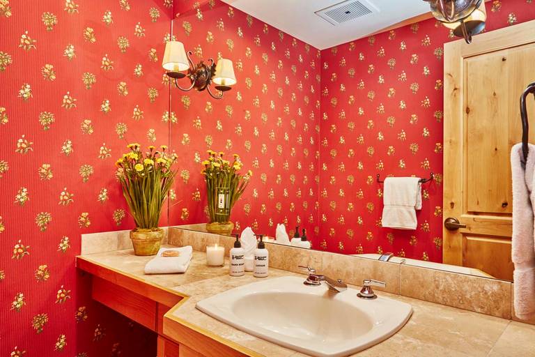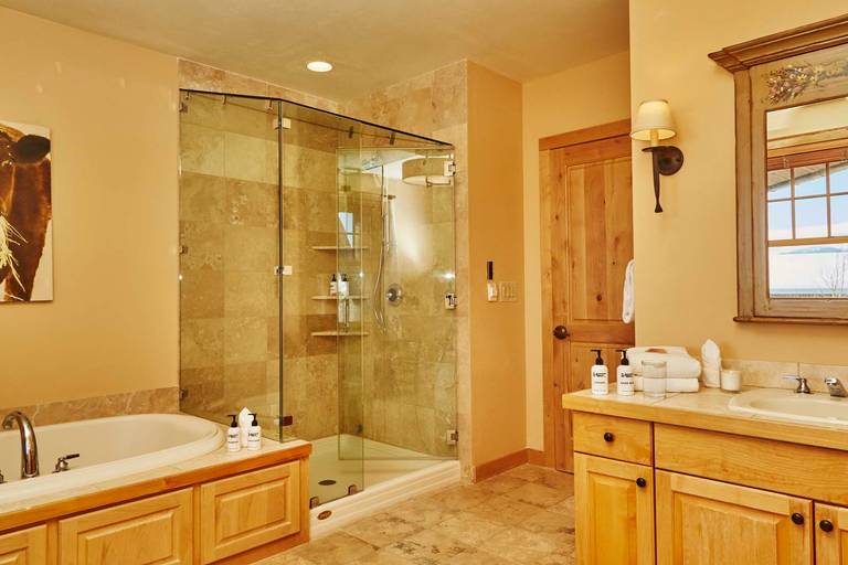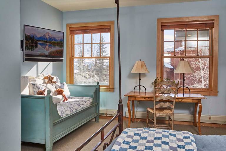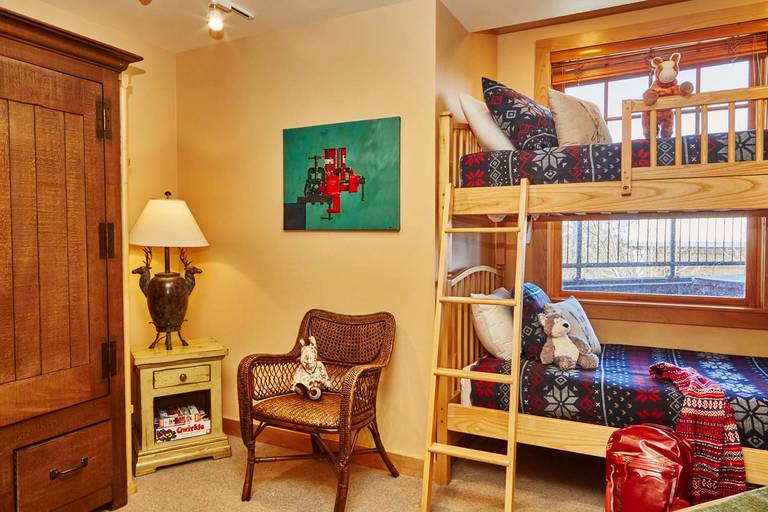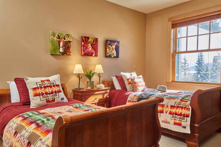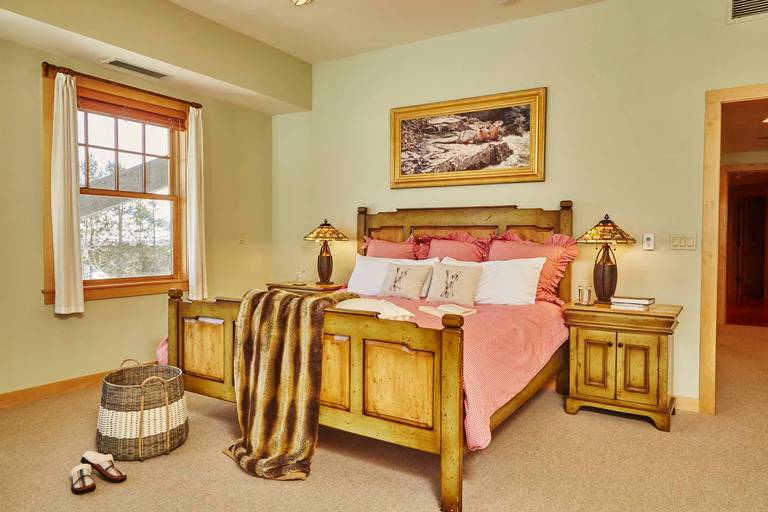 The luxurious master suite features all the amenities of home and then some: a built-in desk, a window bench overlooking Bridger Gondola and a king bed. The spacious private bath has a two-sink vanity, limestone tile work, an oversized Jacuzzi tub and separate steam shower. The junior master suite boasts a wrought-iron canopy queen bed, a wooden day bed, pine furnishings, a large wall-mounted flat screen TV, and a full bathroom. The second guest bedroom has two twin sleigh beds and a full bathroom. The fourth bedroom includes a reading corner, TV/DVD, a set of bunk beds and an armoire, with a powder room across the hall.