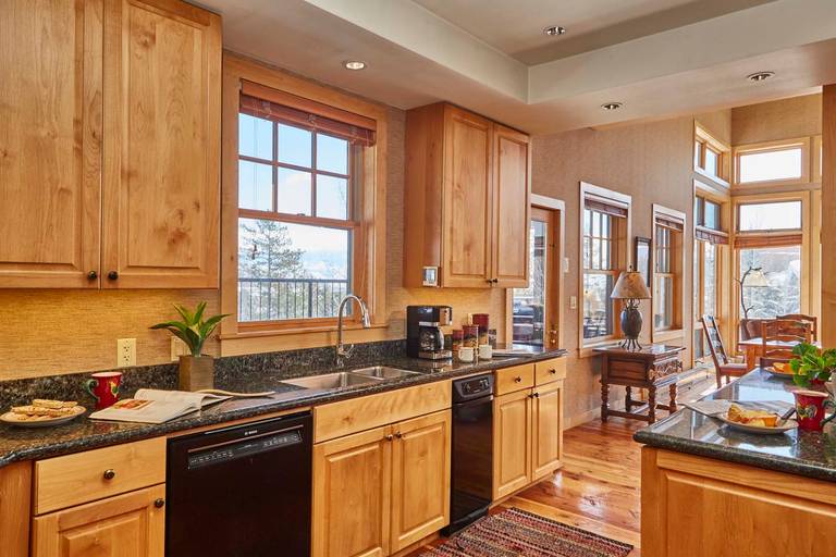 Southeast-facing windows ring the living room on three sides, providing a sweeping panorama of the valley below including the Sleeping Indian. The gourmet kitchen is fully-equipped with a Sub-Zero refrigerator, custom cabinetry, granite countertops and a large breakfast bar that seats six. The dining room centers around a pine table that comfortably seats 10. Just off the kitchen, a deck beckons with a gas grill and hot tub overlooking the slopes.