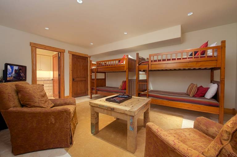 The lower level houses conveniences including a gear closet, laundry room and two-car garage. A family room furnished with couches and a TV doubles as a bonus room with two bunk beds (four twin beds total). Attached, a second bedroom features two twin beds, an ensuite bathroom and walk-in closet.