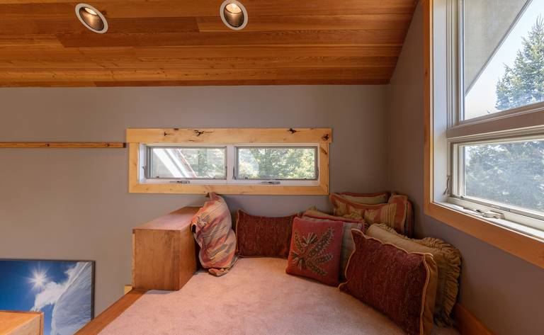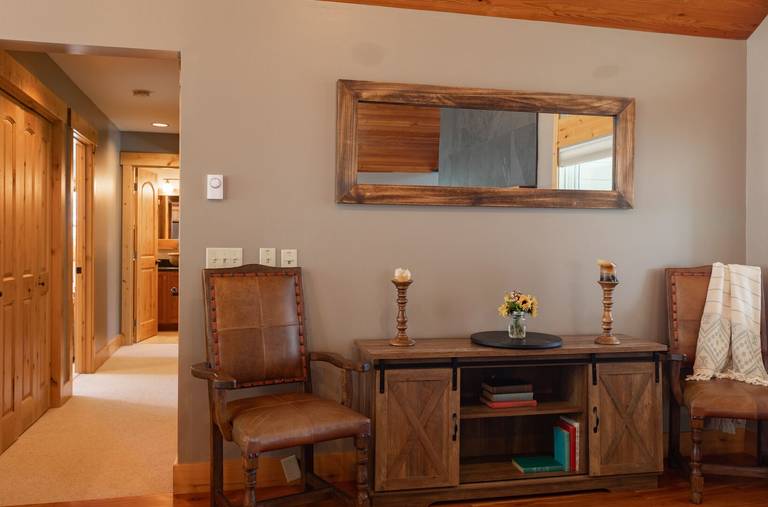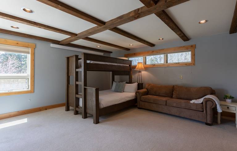 A set of stairs leads to three additional bedrooms and two bathrooms. The first and largest of the bedrooms features a captain’s bunk (twin over queen) and full size sofa sleeper. The en-suite bath offers a standup shower; the walk in closet and hot tub access complete the space. A hallway bath provides convenient access to the remaining bedrooms and offers a shower/tub combo. The second bedroom encompasses a full size lodgepole bed and the third bedroom boasts a queen size bed.