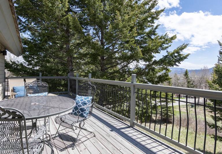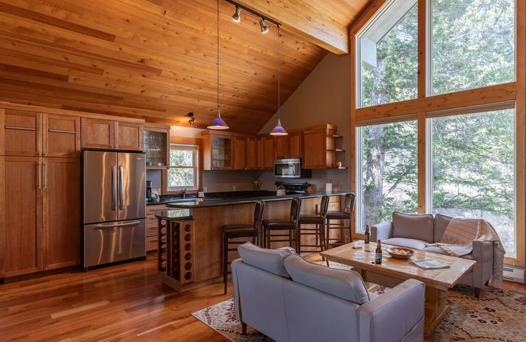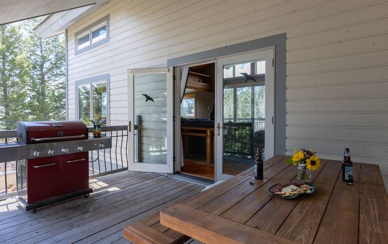 A large tile wall with a built in, modern, gas fireplace ever so slightly separates the great room from the dining area. The great room boasts a large flat screen tv, cozy sectional seating and picturesque views of Rendezvous Mountain. Glass doors slide open to a spacious deck and gas grill.